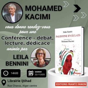 Peut-on écrire des poèmes après Gaza ? Peut-on écrire des poèmes au cœur de Gaza ? C’est à ces questions que répond l’anthologie Palestine en éclats, qui vient de paraître conjointement aux éditions El Manar à Paris et Frantz Fanon en Algérie. Fruit du travail collectif de poétesses palestiniennes et de la traduction de Mohamed Kacimi, ce recueil affirme que la poésie reste une archive vivante face à la tentative d’anéantissement, une manière de préserver l’humanité irréductible d’un peuple. Dans cet entretien, Mohamed Kacimi qui présentera le livre le 20 novembre au Théâtre régionale d’Oran à 17h00 et le 22 novembre à la Librairie Ijtihad à Alger, à partir de 14h00, revient sur le sens politique de cette publication et sur la façon dont la voix des femmes poètes palestiniennes réinvente la résistance.